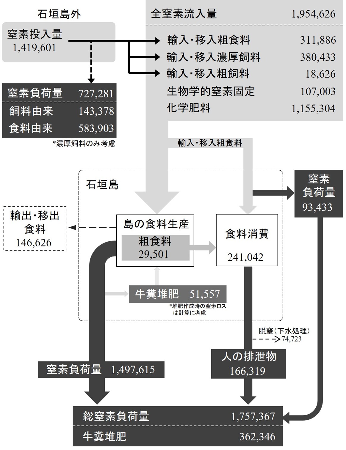 - 石垣島の統計データを用いて、この計算法を適用した結果、島内の化学肥料量は約116万kgN、負荷量は約176万kgNであり、さらに島外 (輸入・移入した食料・飼料の生産地域) に関連する投入量は約142万kgN、負荷量は約73万kgNであることが明らかになりました (図2)。