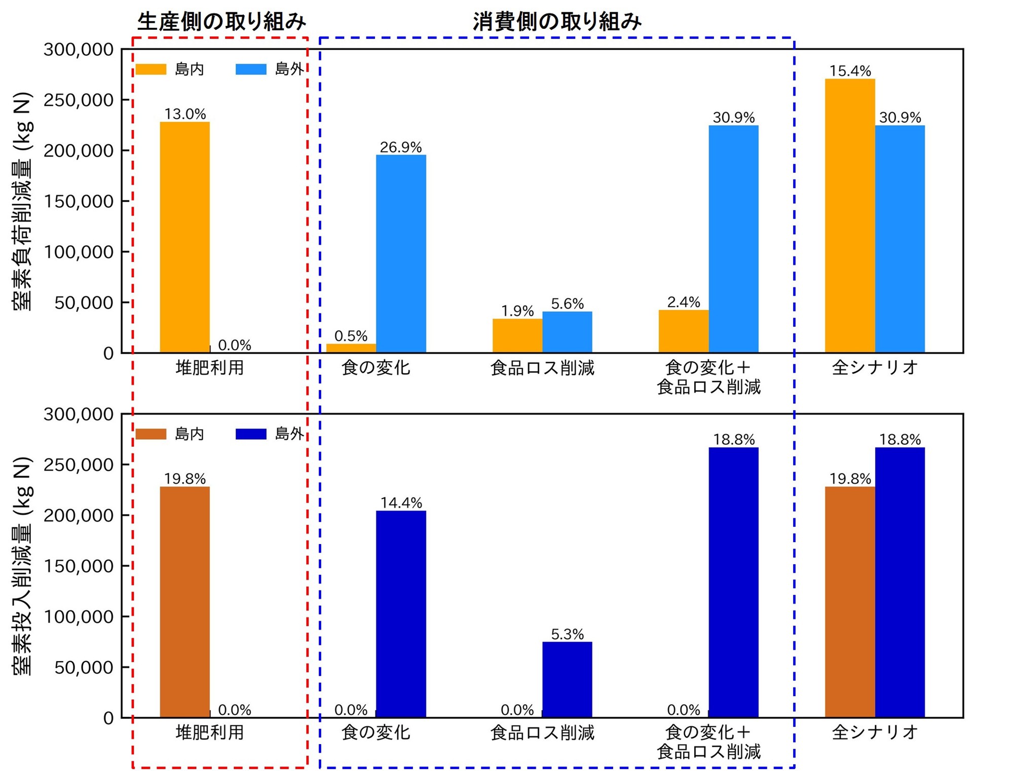 その結果、生産者側では、島内の化学肥料量・窒素負荷量をそれぞれ20%および13%削減できることが示されました。一方、消費者側では、島外地域での窒素投入量・負荷量をそれぞれ19%および31%削減できる可能性が示されました。これらにより、生産者および消費者の両者による働きかけが、島内外における窒素投入や負荷の抑制に相乗的な効果をもたらす可能性が示されました。