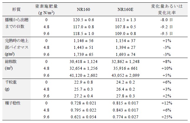 - 籾収量の構成要素を解析した結果、NR160Eは施肥条件にかかわらず出穂期が約8〜10日早まる一方、総籾数・千粒重・稔性 (稔実率、総籾数に対する稔実籾の割合) がいずれの条件でも数%〜25%程度向上していました (表1)。収穫時の地上部バイオマスは両系統でおおむね同程度であり、無施肥及び窒素施肥量50%削減条件でもこれらの改善が見られ、早生化しながら収量性を維持・向上できることが示されました。
