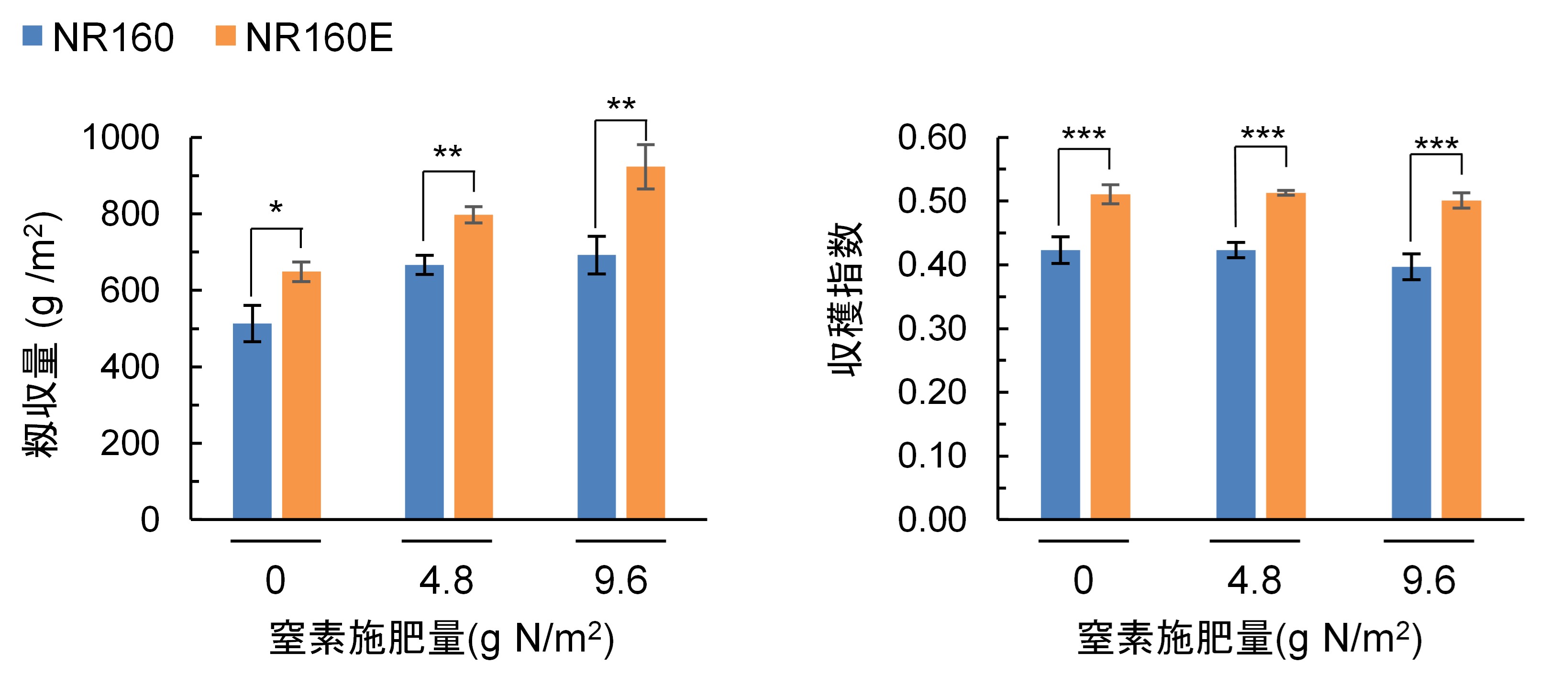 図2 異なる窒素施肥量条件におけるNR160とNR160Eの籾収量と収穫指数の比較