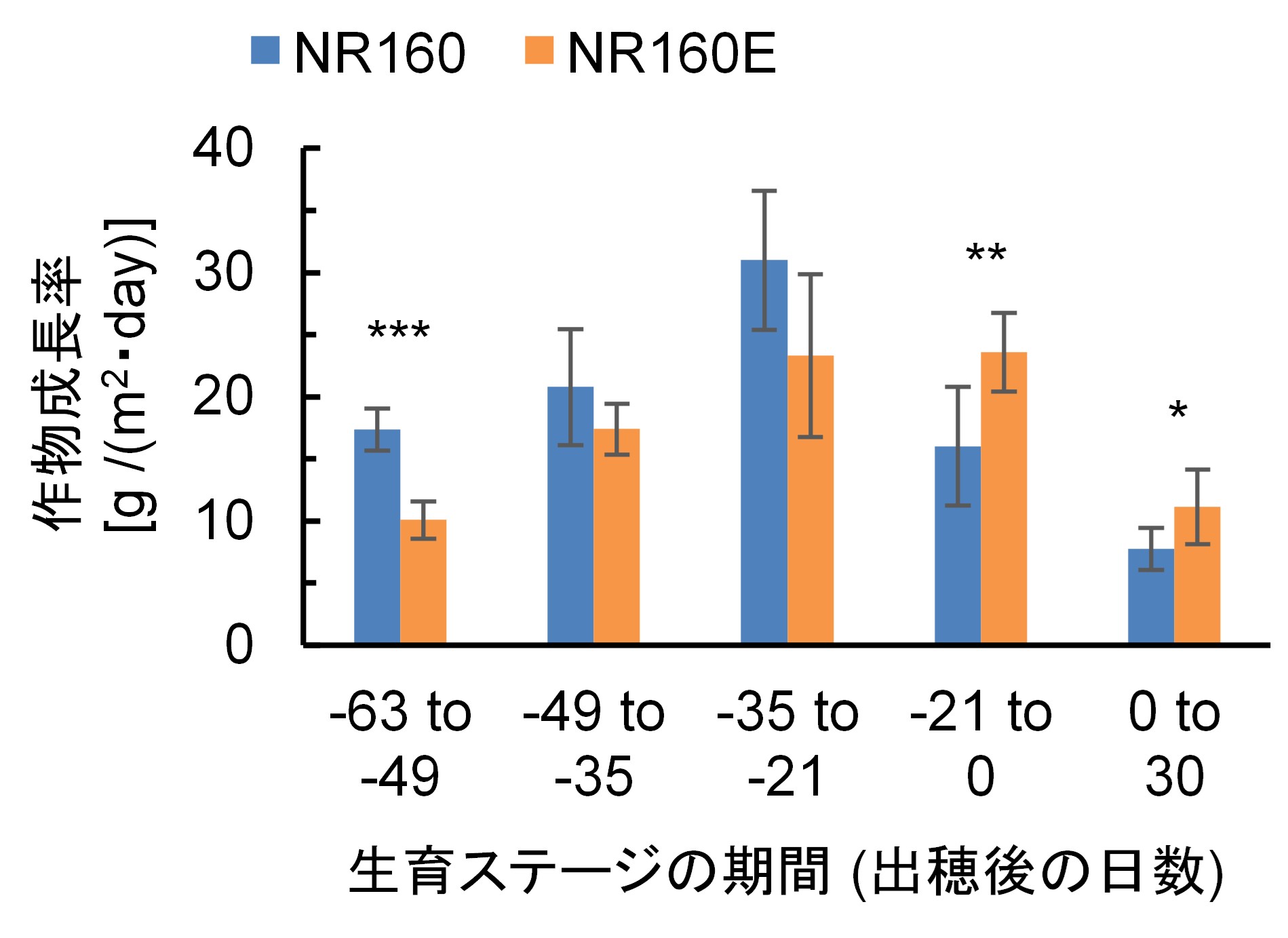 CGRは出穂期を基準とした6つの期間 (出穂期63日前~49日前、49日前~35日前、35日前~21日前、21日前~出穂期当日、出穂期当日~30日後) について評価し、平均値±標準偏差 (n=6) で示しています。NR160 を青、NR160Eをオレンジで示しています。各時点における系統間の差の検定には一元配置分散分析を用いました (*: p < 0.05、**: p < 0.01、***: p < 0.001)。