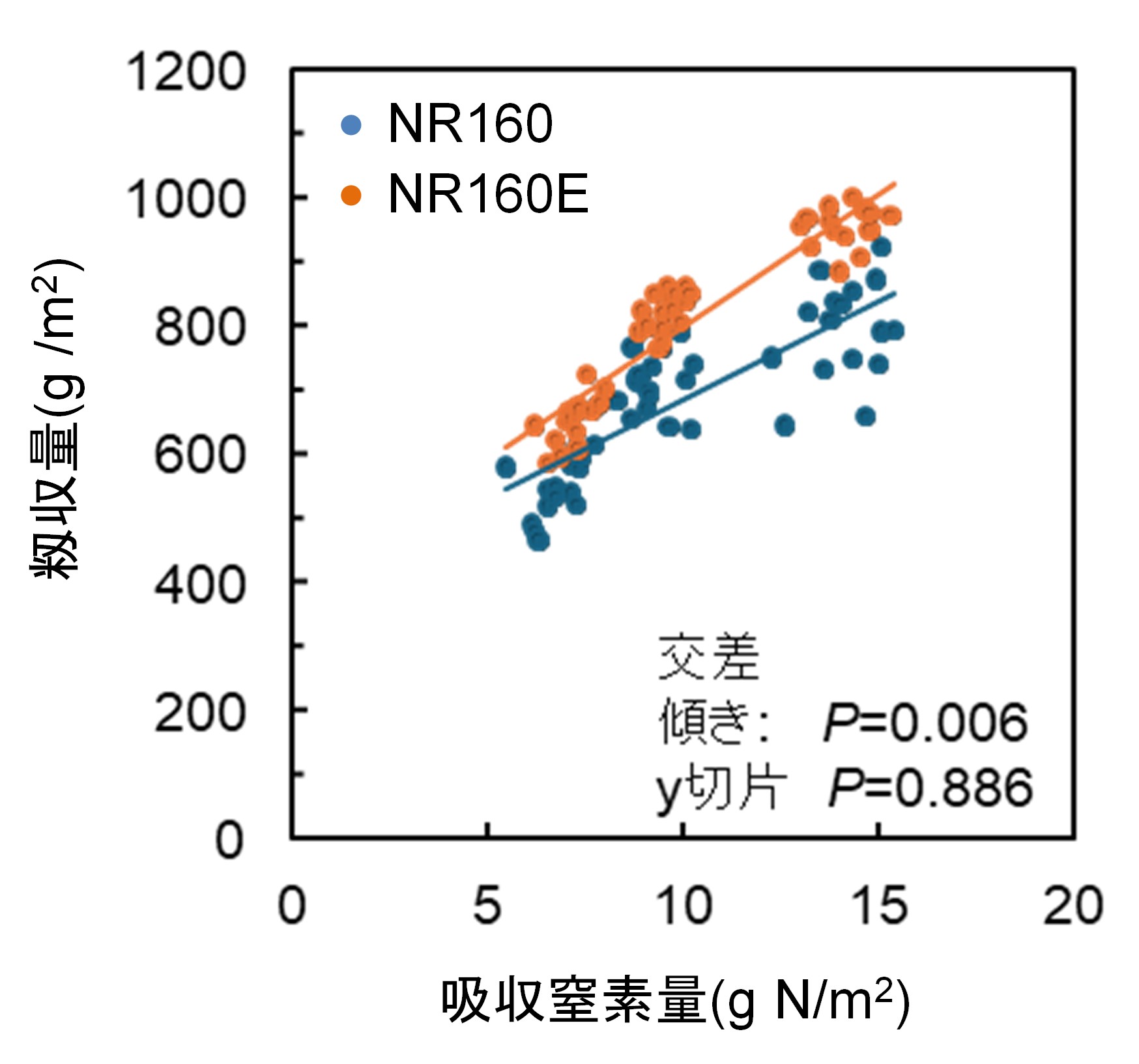 イネは異なる窒素施肥量 (0、4.8、9.6 g N/m2) と植栽密度 (18.5、22.2、37.0、44.4 株/m2) を組み合わせた12条件で栽培し、各系統48データセットについて完熟期の吸収窒素量と籾収量を評価しました。両系統の回帰直線の傾きを共分散分析で比較した結果、NR160Eの傾きはNR160より有意に大きくなりました。このことから、NR160Eは同じ吸収窒素量でより多くの籾収量を生産でき、窒素に対する収量反応性が高いことが示されました。