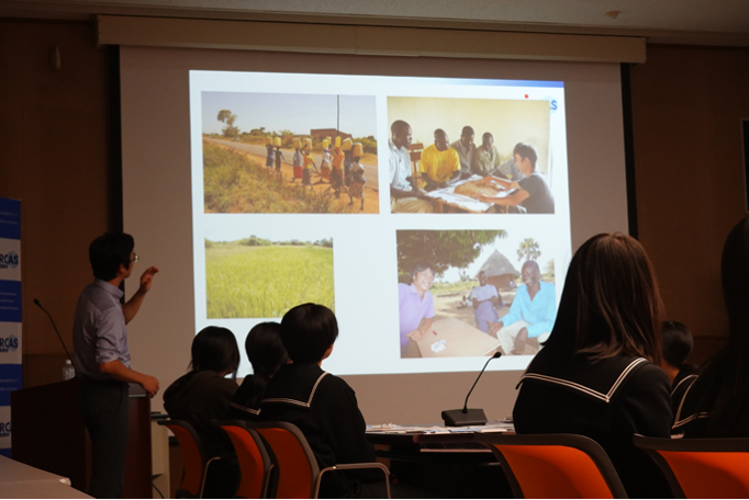 続いて、社会科学領域の尾崎諒介研究員による講義が行われました。講義では、アフリカにおける貧困の現状と、農業を通じた解決策の可能性について説明しました。アジアとの比較も交えながら、アジアでは単位面積あたりの収量向上が食料生産の増加に寄与している一方、アフリカでは耕作面積の拡大が主な要因であることを、データを用いて解説しました。