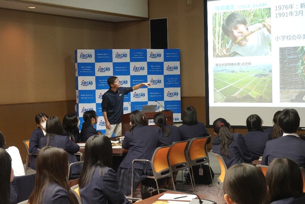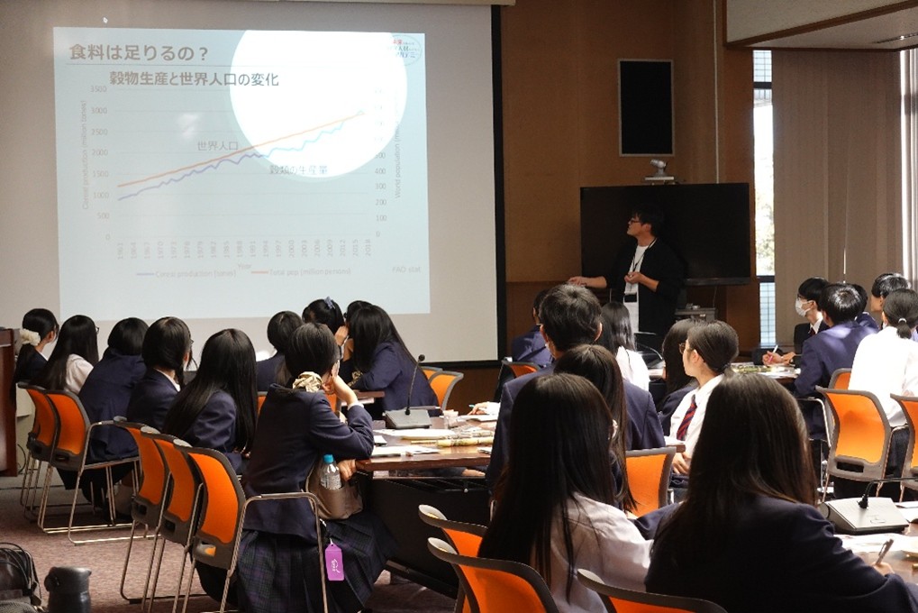講座の冒頭では、JIRCASの研究活動や国際共同研究の概要を紹介し、世界各国のパートナーと協力して進める農林水産分野の研究が、日本に住む私たちの食や生活にどのように貢献しているかを説明しました。特に、日本の食料生産の現状や国際的な食料生産・流通にも焦点を当て、日本が開発途上国での研究や技術開発への協力を進める意義について、生徒自身が考える機会を提供しました。また、現在、問題解決に対応できる人材として強く求められている、グローバル人材・科学技術イノベーション(STI)人材についても説明しました。
