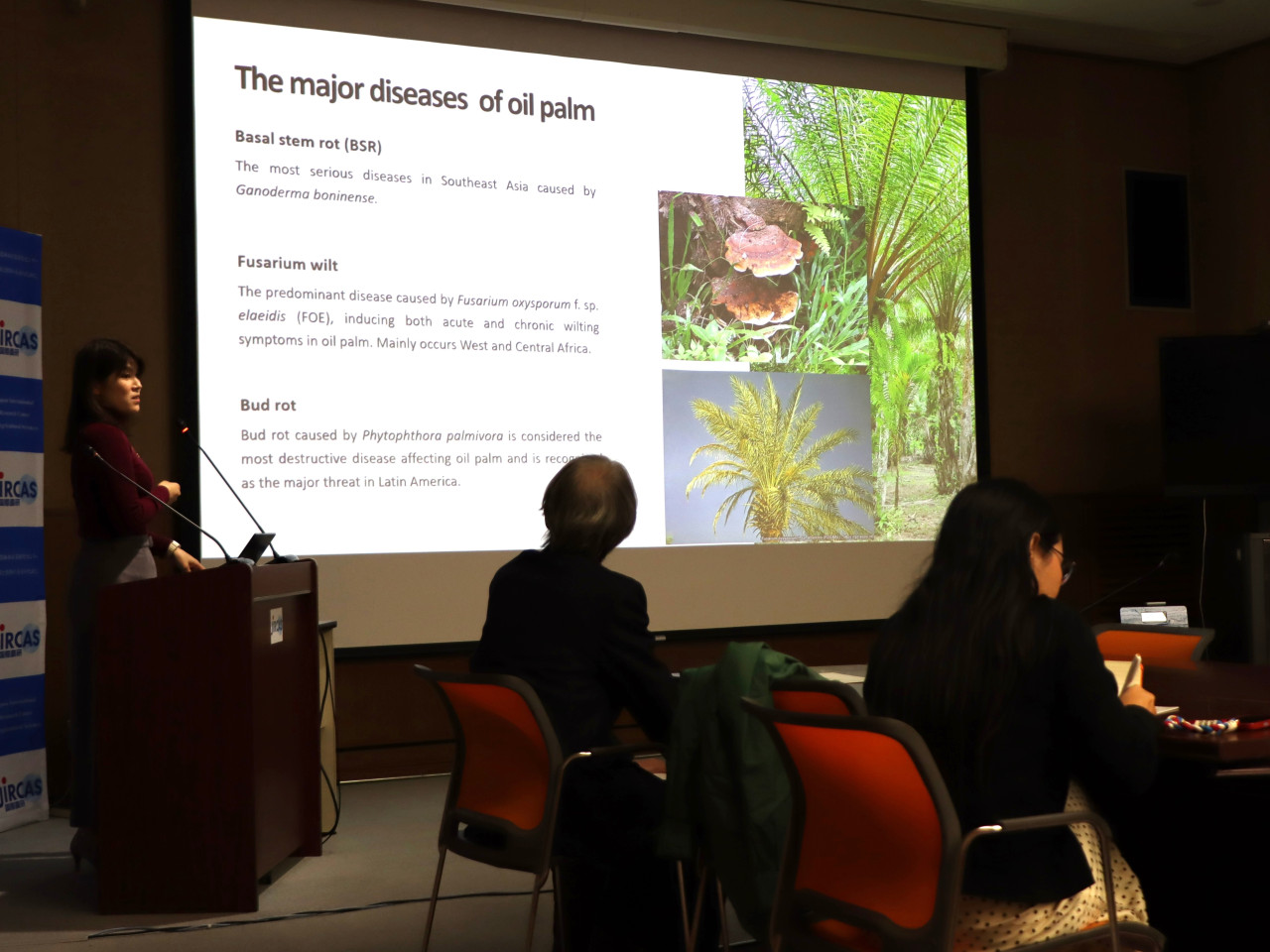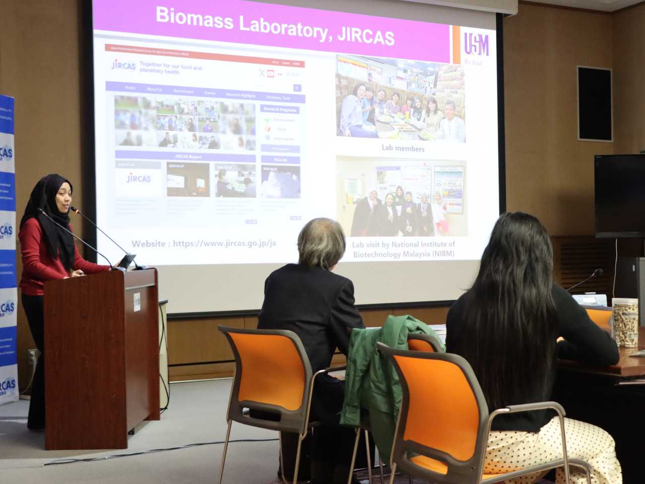講義では、鵜家綾香研究員(生物資源・利用領域)が「農業廃棄物から持続可能な解決策へ~バイオマス利用と植物病理の融合~」と題し、東南アジアの植物病理研究と微生物糖化技術を組み合わせた取り組みを紹介しました。講演の中では、オイルパームバイオマスから製造した燃料用ペレットの実物も示し、研究の応用可能性について説明しました。続いて、筑波大学理工情報生命学術院生命地球科学研究群に所属し、マレーシア理科大学(USM)からの講習生であるMs. Hanis Alisaが、JIRCASとの共同研究「オイルパーム古木におけるデンプン蓄積メカニズムのトランスクリプトーム解析による解明」を紹介しました。