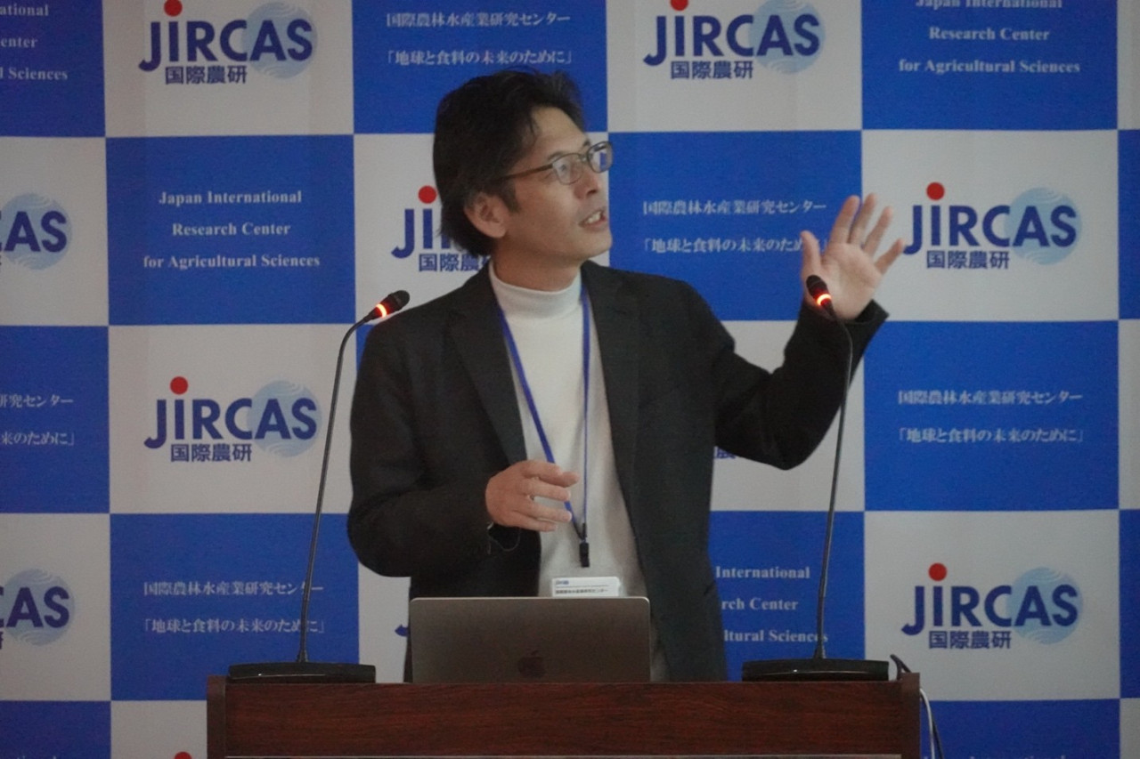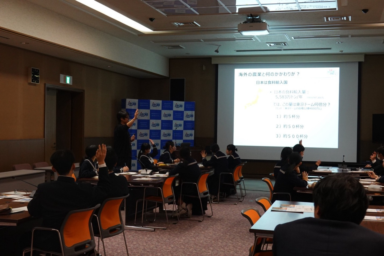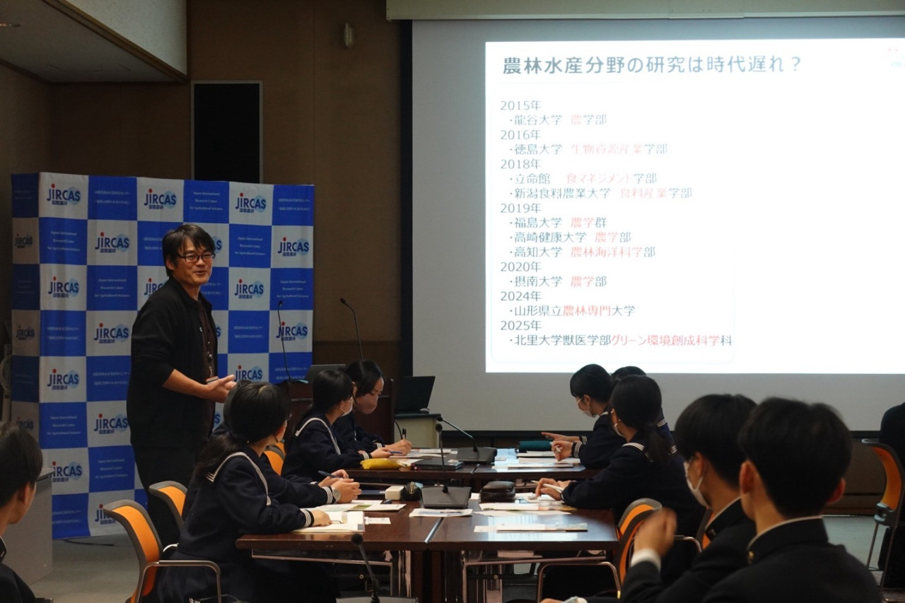 講座の冒頭では、JIRCASの研究活動や国際共同研究の概要を紹介し、世界各国のパートナーと協力して進める農林水産分野の研究が、日本に住む私たちの食や生活にどのように貢献しているかを説明しました。特に、日本の食料生産の現状や国際的な食料生産・流通にも触れながら、日本が開発途上国での研究や技術開発への協力を進める意義について、生徒自身が考える機会を提供しました。また、現在求められている問題解決型人材像とグローバル人材や科学技術イノベーション(STI)人材についても解説しました。