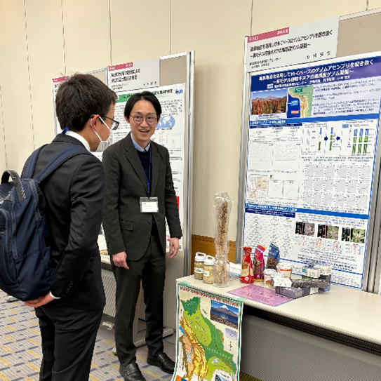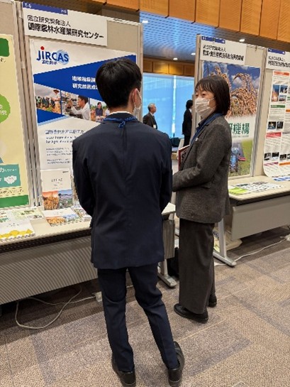 ポスター展示ブースにはテーマに関心を持つ方々が立ち寄られ、研究者の分かりやすい説明を熱心に聞き入っていました。展示ブースには、情報収集を目的として立ち寄られる方が多く、進路を検討している学生を始め、国際農研への就職に関心を持つ外国人の大学院生もいました。