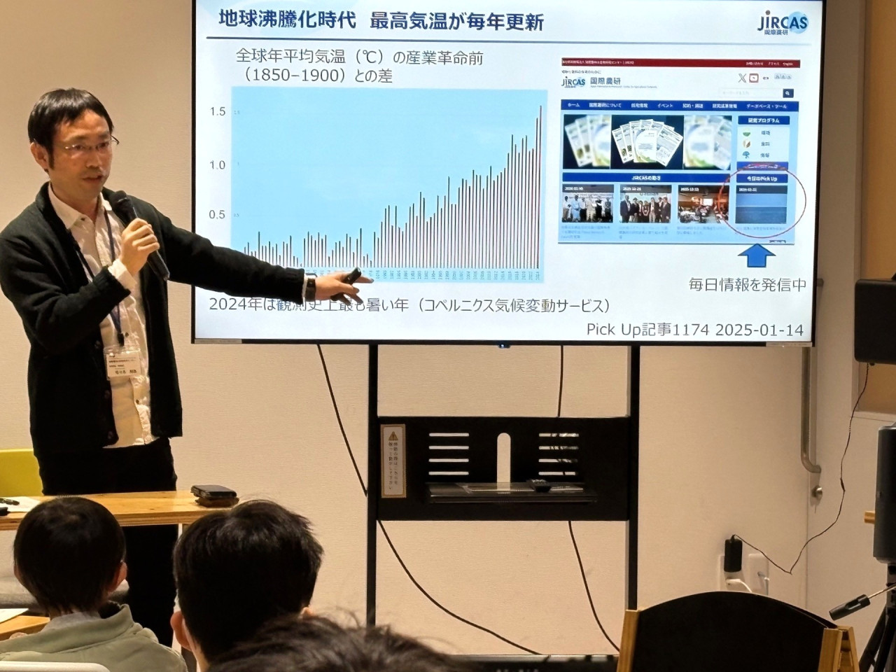 主題講話では、JIRCAS生物資源・利用領域の佐々木和浩主任研究員が「暑さに負けないイネはどう作る?」と題して、高温ストレスによる不稔の発生や、これに対応する早期開花遺伝子の特定・育種に関する研究成果を紹介しました。続いて、JICA筑波の研修指導者・柿沼翔大氏が「カメルーンの事例に学ぶ技術を広めるための仕組み作り」と題し、現地のコメ振興プロジェクトにおける技術普及の工夫や、農家が利益を得られる仕組みづくりについて分かりやすく説明しました。