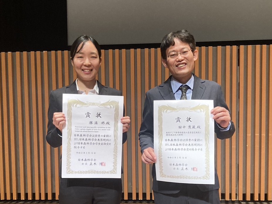 また、日本森林学会学生奨励賞は、将来性ある若手研究者の研究成果を顕彰するための賞です。勝浦研究員は、名古屋大学在学中に実施した、同位体を用いた樹木の根の吸水深度の推定に関する研究「Seasonal and interspecific variations in the water uptake depth of trees in a moist cool-temperate mixed forest in Japan」が高く評価され、本賞を受賞しました。現在は国際農研において、熱帯林業樹種の根の機能など、森林の地下部に関係する研究をさらに発展させていく予定です。