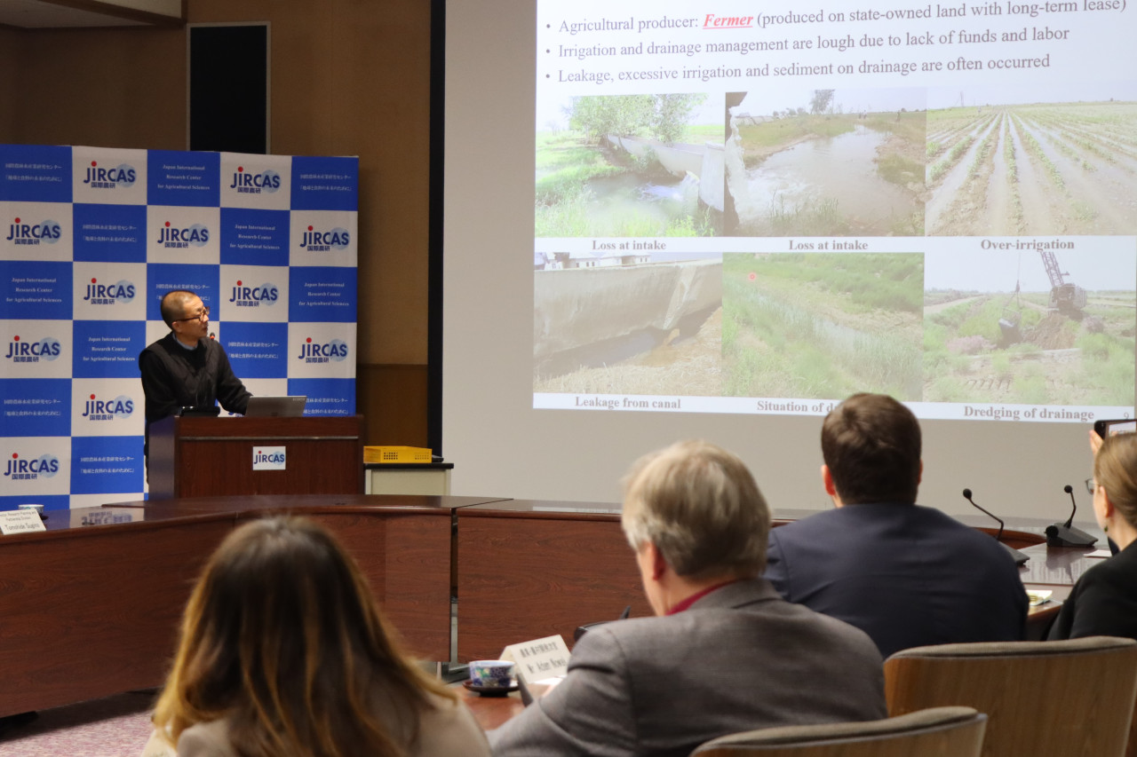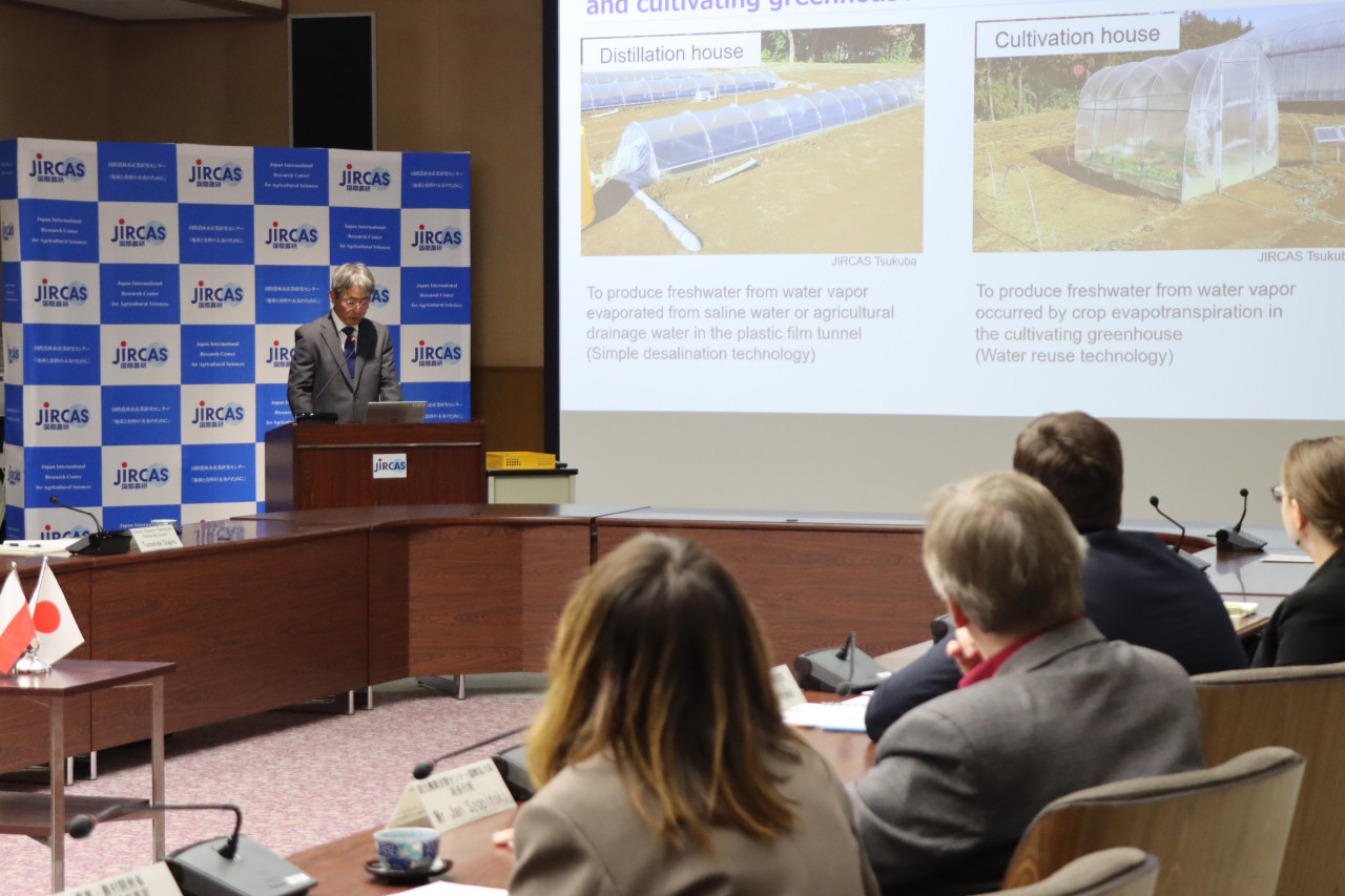 国際農研からは、概要紹介に続き、大西純也プロジェクトリーダーと池浦弘主任研究員が、節水型浅層地下排水の技術や温室内の水蒸気から淡水を生成する技術を紹介しました。ポーランド農業・農村開発省からは、降雨パターンの変動による干ばつ・洪水発生状況や、農業従事者の高齢化の状況が説明されました。