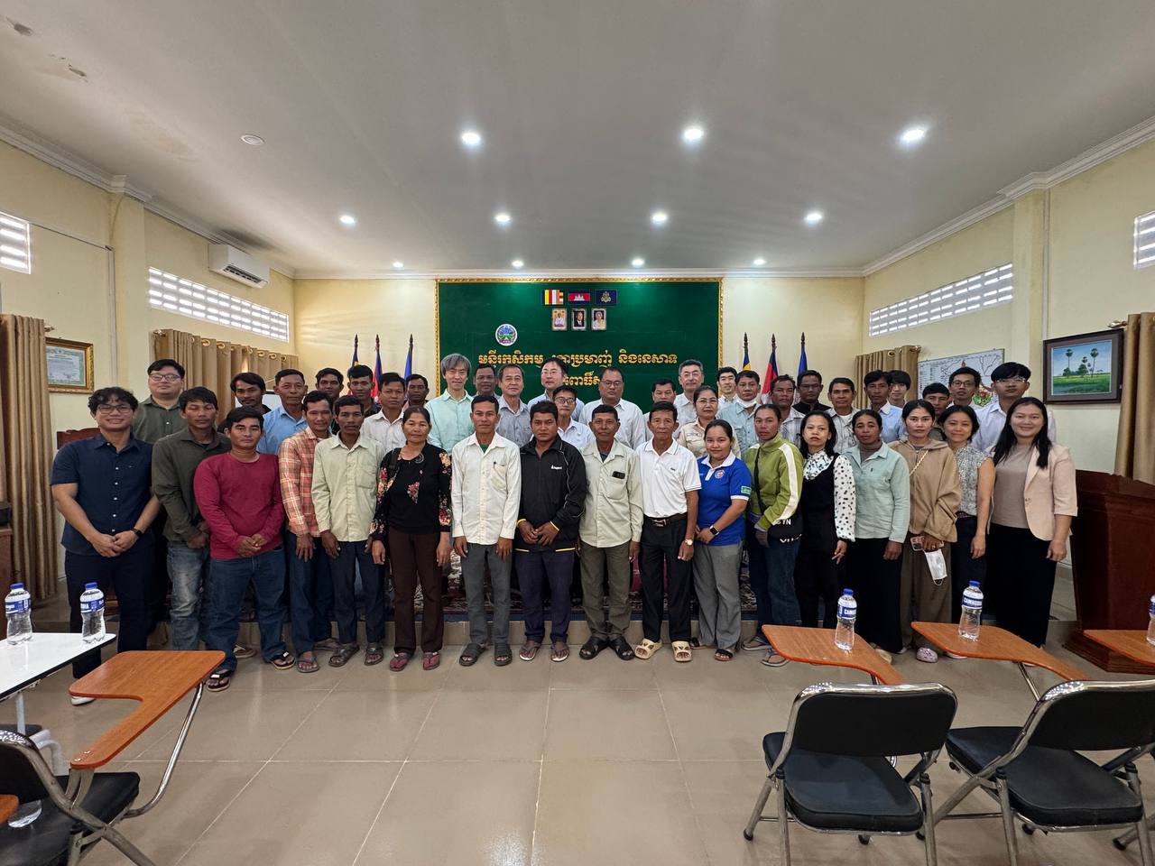 2025年12月2日、第8回農民水利組合ワークショップをプルサット州農林水産局(PDAFF)で開催しました。今後の間断灌漑(AWD)を実施に向け、プロジェクトサイトの農家を対象に、田越灌漑による水田間の水管理の状況を把握することが目的です。農家、政府関係機関職員、王立農業大学カウンターパート、日本人専門家・研究者など合計45名が参加しました。農家には、灌漑ブロック単位の大きな地図に、ポンプの利用状況や水田間の水のやり取りを矢印の付箋を貼ることで明らかにしてもらいましたが、実際、田越灌漑の状況は非常に複雑であることがわかりました。