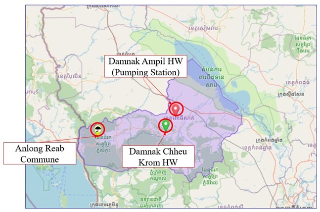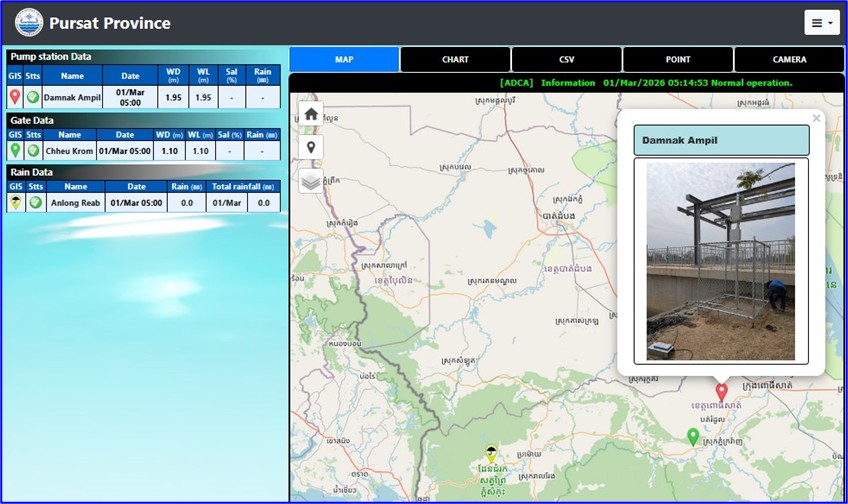 プロジェクトのチームは、プルサット州において、カンボジア水資源気象省(Ministry of Water Resources and Meteorology: MOWRAM)およびプルサット州水資源気象局(Provincial Department of Water Resources and Meteorology: PDWRAM)との事前打合せを通じてテレメトリー機材の設置計画を確認したうえで、プルサット川上流域であるAnlong Reabにおいて雨量計を設置し,中流から下流域に位置するダムナック・チュークロン(Damnak Chhue Krom)とダムナック・アンピル(Damnack Ampil)では河川水位計を設置しました。雨量や水位のデータはクラウド上で保管され、パソコンやスマホで確認することができます。