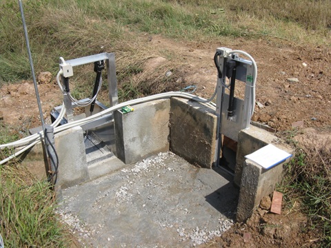 2026年3月9日から12日にかけ、プロジェクトサイトの三次水路にチェックゲートと取水ゲートを設置しました。これまで設置した水位計測制御盤による水田や水路の水位データをもとに、ゲートは、今後設置される電動ポンプとともに遠隔・自動で操作され(手動操作も可能)、間断灌漑を行う予定です。