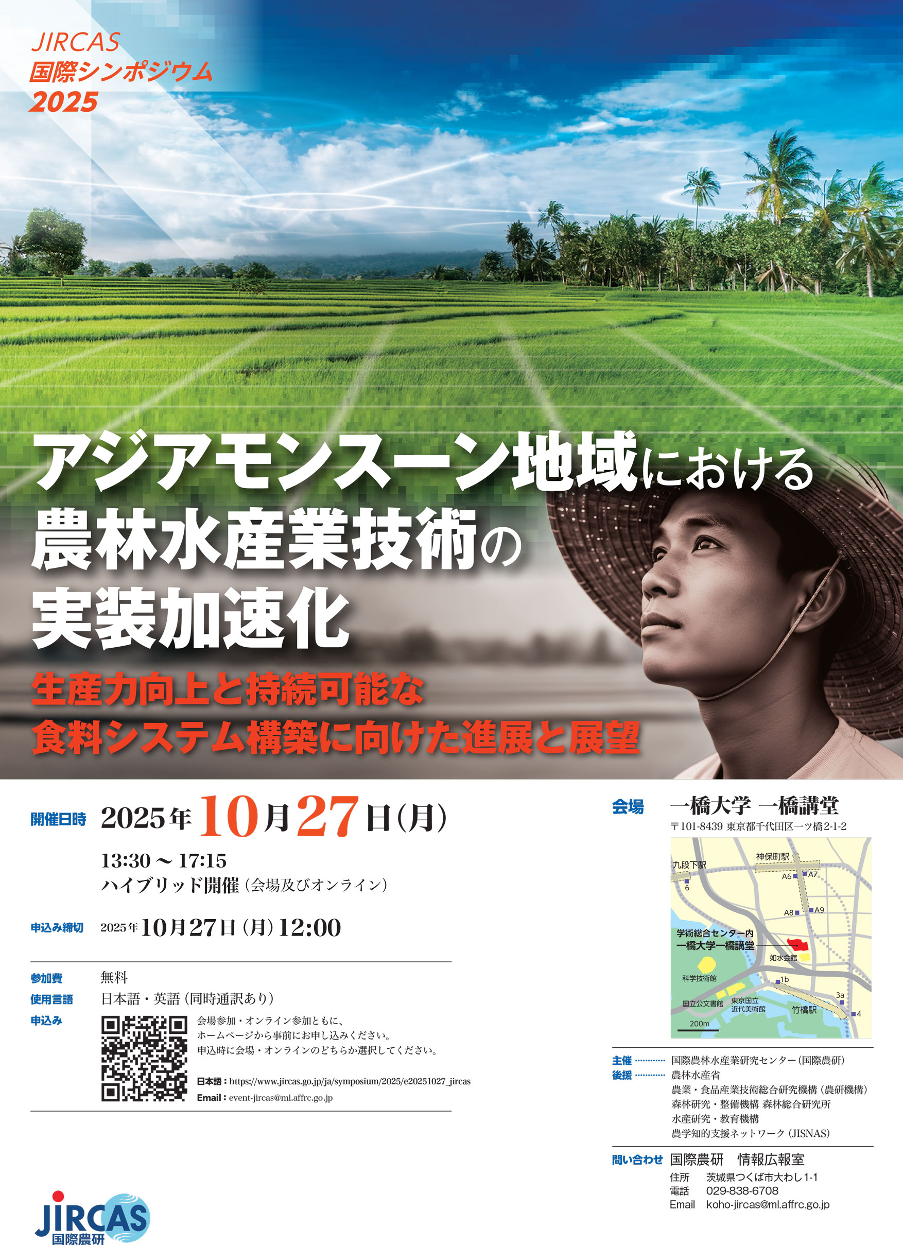 国際農研 情報広報室住所茨城県つくば市大わし1-1電話029-838-6708申込締切:(日本時間)Emailkoho-jircas@ml.affrc.go.jp備考会場参加の方には、講演要旨集(アブストラクト)を配布いたします。また、Q&Aセッションにも参加していただけます。